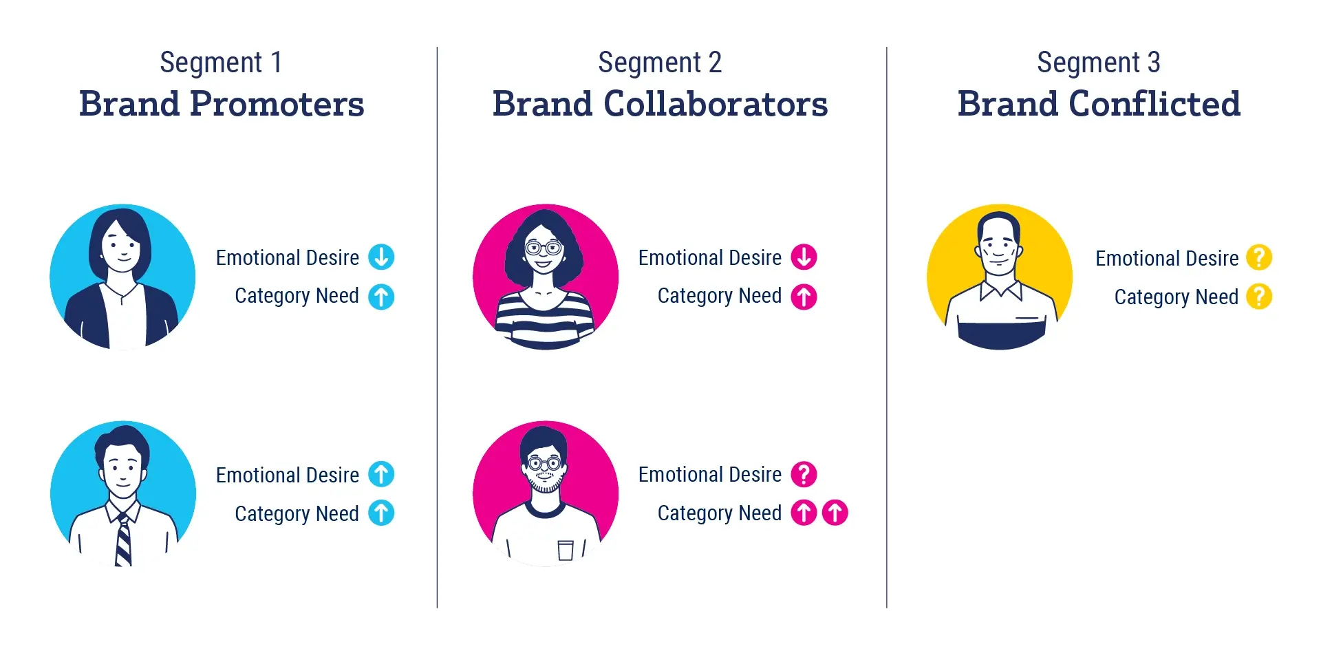A needs-based segmentation is a broader grouping of categorical needs and desires which provides plenty of space for additional research while providing short-term direction and inspiration. Audience personas can then be developed after one or more segments have been identified.