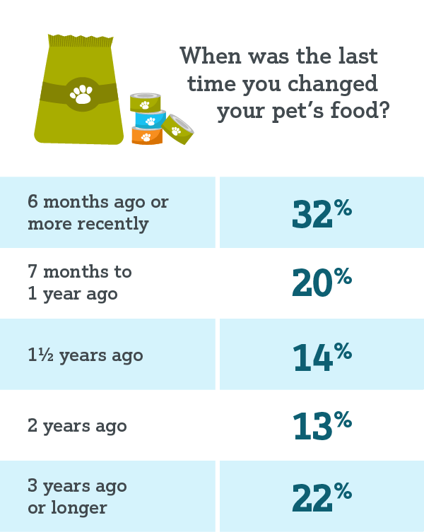 So why are more than half of pet owners changing their pets’ food so frequently? The top two reasons cited are a desire to provide more variety and seeking more nutritious options. Secondary reasons for switching a pet’s main meal are changing age requirementsgeneral pickiness toward their previous brand and learning the previous brand was not as healthy as they originally thought.